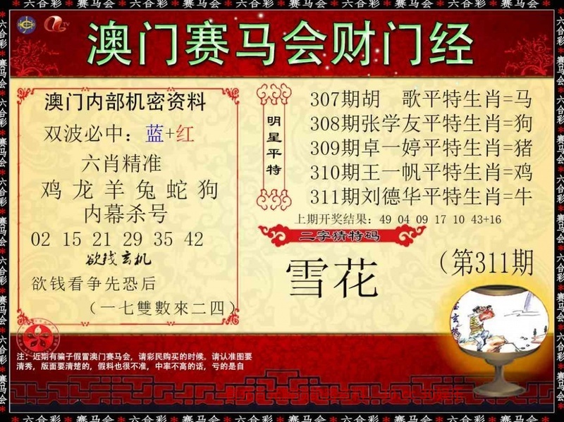 | 311期七肖 | 马猴羊蛇龙虎鸡 | 开:蛇37 |